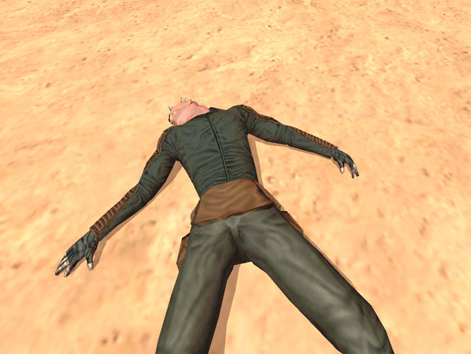 "Let me help you..." he offers, crouching down to survey my wounds "but hey, maybe you can help me out too. Do you know where I can find Jabba's Palace? I hear he has a job of the utmost importance involving a Corellian space ship that needs taking care of".