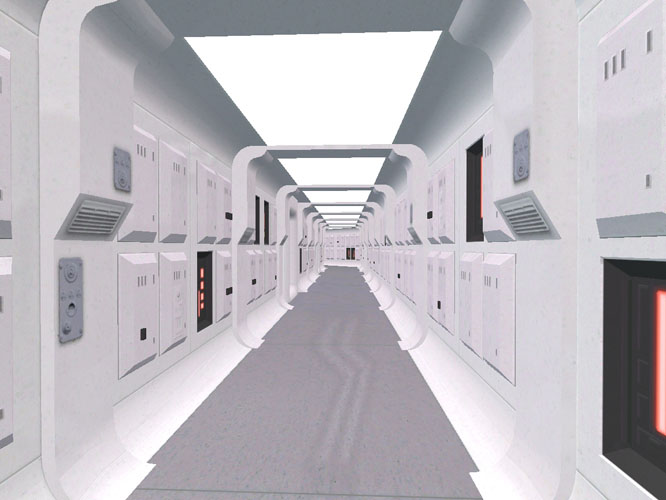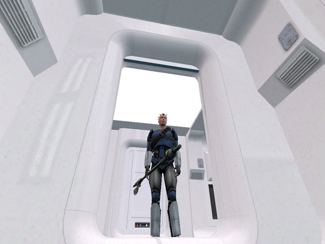 As if by magic, we instantly find ourselves onboard the Corvette, having blown a small hole through the hull and quietly squeezed ourselves in (lack of oxygen be damned). All is quiet, just as we'd hoped, as we slowly open the door to the main corridor. It's completely empty, but oddly enough...there's something familiar about this place.