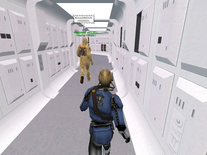 But what the hell? From behind me I suddenly hear a load roar, and before I can register what's going on, Wooly the demented Wookie has casually decided he's bored and to break radio silence. Just like that, off he charges, straight past me and head on into the enemy soldiers stationed around an upcoming bend...for some reason naked, no less. Not only that, but to add insult to injury, he's gone the wrong way.