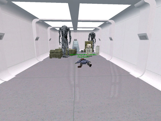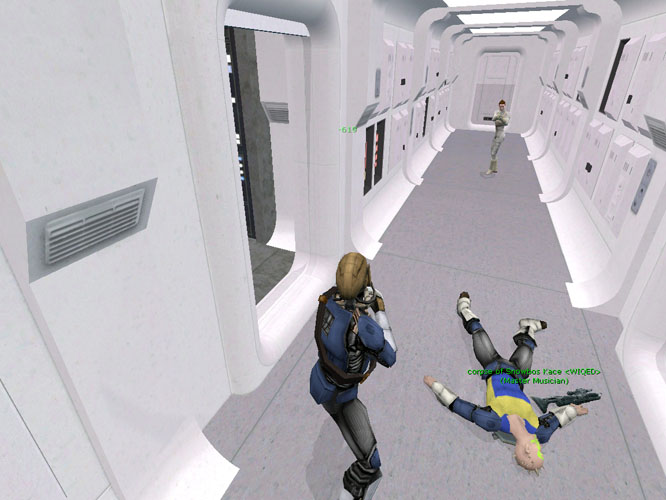 We key in the pass code to the armoury and kick the door, err, up, charging in full speed. Almost immediately I'm struck to the ground. I'm all but dead, yet just about manage to hold on to consciousness long enough to witness Irabrai's selfless act of courage in my wake. He runs, he sidesteps, he leaps, he dives, constantly dodging all the firepower the Corellian Corvette can muster, not a single shot scorching his luminous yet ridiculous green hair. Eventually he slides up to the treasure chest in the corner of the armoury and flips open the lid ready to grab the riches within.