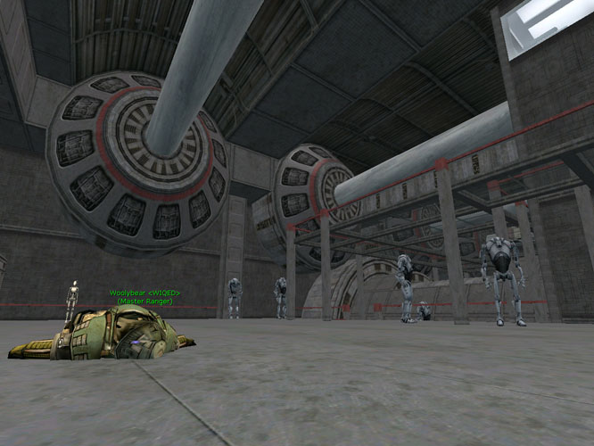 Surprisingly enough, the humungous mutated ewok we call Wooly, is still alive and well elsewhere on the ship. Stripped of all luxuries such as armour, weapons, and pants, the Wookie has taken it upon himself to charge up and down the length of the ship destroying anyone and everything in his path. In turn the Corsec troops decide to pull out the big guns and combat this abomination of nature with five Super Battle Droids - humungous walking laser guns that only a Jedi could possibly defeat. Wooly is gunned down shortly after, but oddly, I don't shed a tear this time.