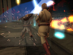 Oh yes, that's another sweet addition to the series; the ability to play as them wielders of laser swords and bad acting, the Jedi (not to mention the Sith). Thankfully, they handle great. It's simple stuff really; one lightsaber attack, a couple of force powers and a super charged force jump, but my god is it a blast. They really capture that high speed feeling of the Clone Wars series, with Jedi leaping around and wiping out hordes of enemies amidst hails of gunfire.