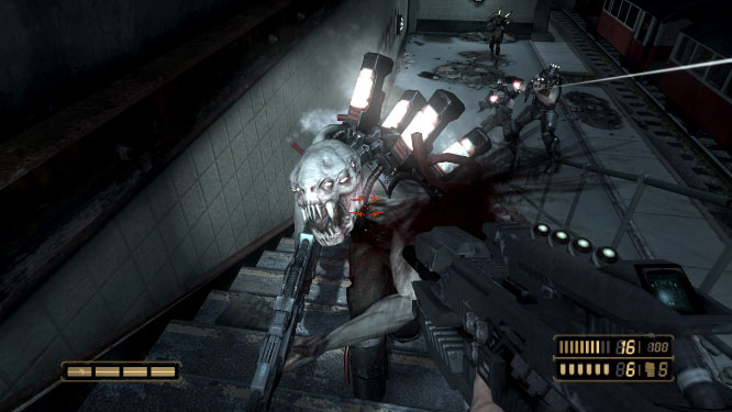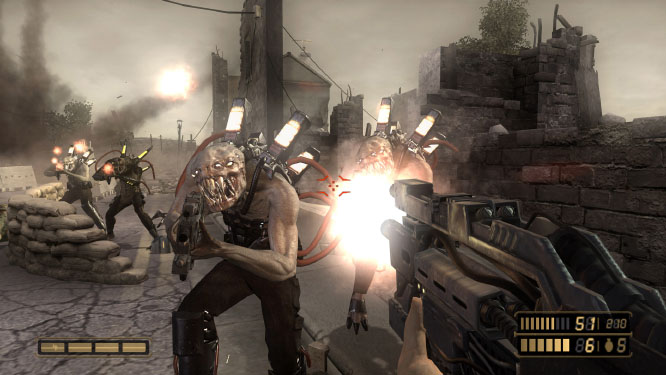 point of Resistance though, and as a result it feels little more than a slightly damp Call of Duty rip-off in its first few hours. What starts to become more and more obvious as you explore its 10 odd hour campaign though, is that Half-Life has been a far more successful influence here, and the game's all the more better because of it. It can be seen through the in-game cut-scenes, the alien designs, the ace use of physics and in sheer look and feel too. If you're gonna steal, steal from the best they say, and Resistance does an ace job of doing exactly that.