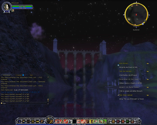 Do I have complaints with Lord of the Rings? Other than the slightly disappointing size of the world, my biggest concern right now is actually the music. To be blunt, it's dull as dishwater. One key area where Turbine specifically avoid any and all similarities to the flicks is in the soundtrack, and it makes a hell of an unfortunate difference to the overall atmosphere of this thing. Running across sun-bathed hills and snow-capped mountains just doesn't get the Rings vibe piling in that you'd expect when you ain't got Howard Shore's brilliance blaring out of the speakers back at you though. LOTR's built-in tunes are minimal, bland and rather joyless by comparison...when what it really needs is a proper, big fuck-off orchestral score bringing it all to life. In fact, I err, "borrowed" a selection of MP3s from the various LOTR film soundtracks just to whack on in the background for that exact reason, and was surprised to see just how freakin' better it all came together in comparison. At least it's fixable, I guess.