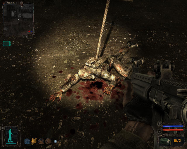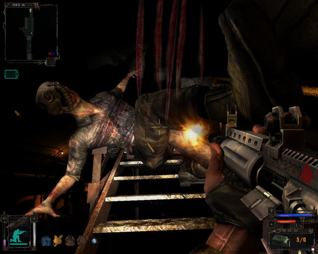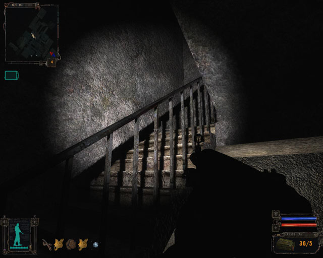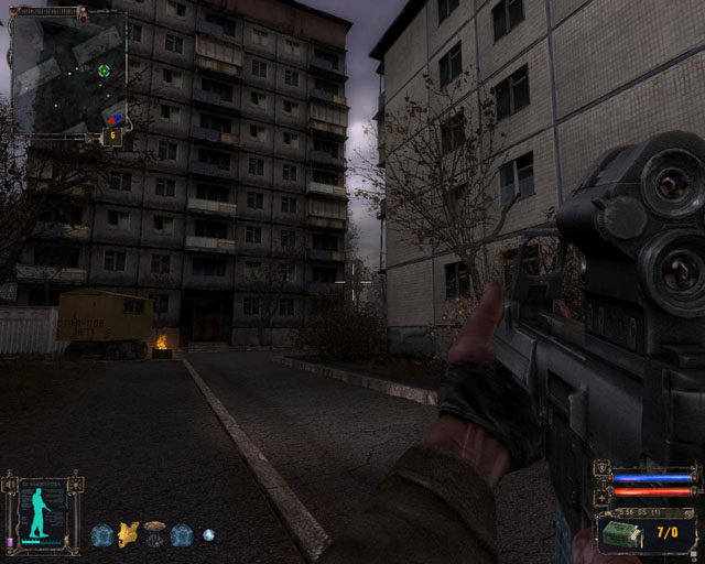 | I can't resist. It's barely 20 meters away and is calling my name. I clamber over and bend down to pick it up...but am promptly cut-short. My radar informs me two stalkers are hanging out in a building directly above me! I whip out my pistol and chuck my last clip in. Time's running out as I continue to bleed precious bodily fluids all over my feet - and my aim is off as a result - but a quick peek through a window and a barrage of shots later, the fuckers go down. Click, click. Empty clip.