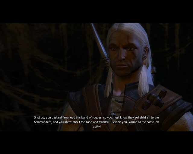 | | Geralt ain't your typical hero. His personality varies depending on choice, naturally, but the guy in general seems way more womanizing, mean and a fuckin' hard bastard than the standard gaming fare. Even so-called "good" dialogue choices drift more towards Bauer-isms |