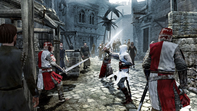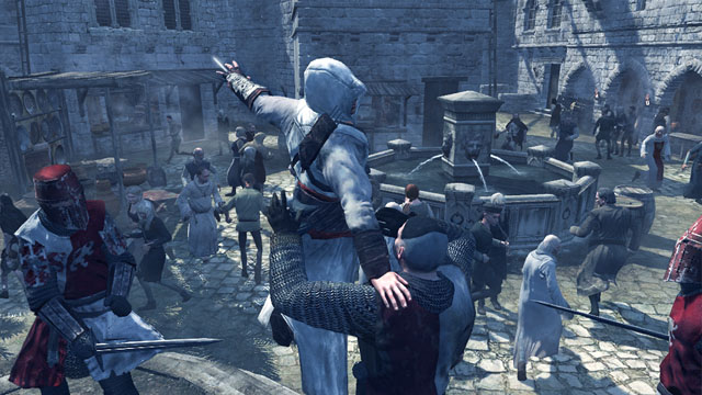 The "R" trigger and "A" buttons invoke the free-running stance though, and when in effect, Altaïr will charge, clamber and vault in whatever direction you push him...leaping over fences, running up sheer walls, and even diving through market stalls to much vexation of their owners. It actually handles less like a traditional platformer with that in mind, and more like some kinda human driving game, with you merely "steering" Altaïr than all-out controlling him. Your true test of skill becomes avoiding obstacles, fellow civilians, and the all-too-prominent city guards, as opposed to constant button taps. Fail to do said avoiding, and our boy'll topple over in beautifully animated calamity, often signaling the difference between a clean getaway...and a sword-wielded gang-bang.