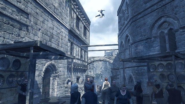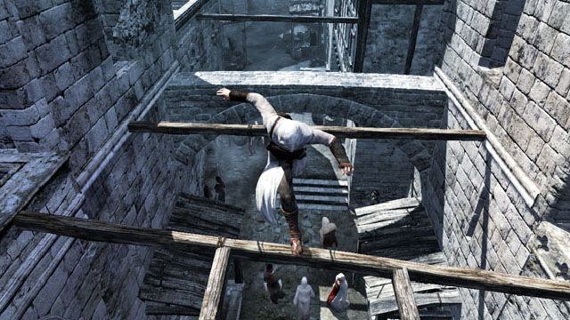 That's Assassin's underlying pitch though; the first (real) free-running game. A platformer with a difference. The idea being you use the principals of said discipline to find the quickest and most direct route to your soon-to-be dead mark, before carrying out the deed and making the sleekest of aerial get-aways. It wastes no time getting you up and free-running yourself with that in mind, with said cities taking just way too damn long to traverse by pavement, and thus designed around the concept pretty much from the ground-up. Every single window ledge, wooden beam and most insignificant of stone outcropping can be grabbed, climbed up and leapt off, resulting in cities more akin to virtual climbing frames, than a collection of roads and buildings.