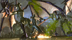 A little "Mortal Kombat" it may be - particularly in comparison to the original's more minimal slicing 'n' dicing - but you'll rarely laugh as loud as you do each and every time you batter a foe so damn hard a mere torso is all that remains. This new found ability to hack off any and every limb does serve some minor gameplay purposes too. The new "obliterations" allow you to insta-kill any enemy that's partially wounded in this manner...a split-second pre-canned finisher of sorts, that's not only fuckin' fun as hell to watch, but more importantly allows you to mow down enemies far quicker than traditional hacking 'n' slashing ever could. Neat.
