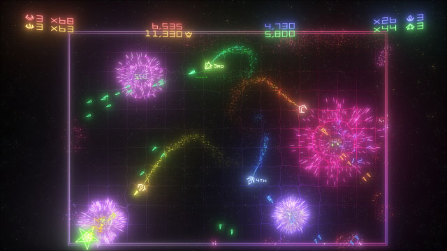Championship Edition mode. It rids you of the annoyance of lives, and essentially just chucks you into an arena for three minutes to score as much as possible. Standard twin-stick pew-pew Geo Wars gameplay then - as you roam the rectangular world and mow through luminous shapes - but the new quick-fire "in 'n' out" nature most definitely suits those of us who had to previously put upwards of 45 minutes into the original to even come close to bettering our high scores. This, I approve of.