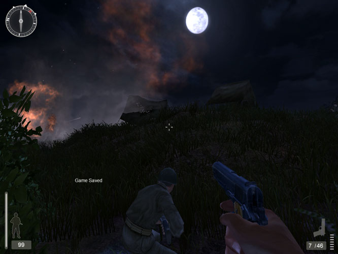 After taking enough damage, you'll eventually find yourself incapacitated. Here all the colour on the screen starts to dissolve, and things become very dark and scary. Sound becomes muffled and distant. The world slowly starts to disappear, and you'll even hear ominous voices from your past before you finally pass away. This whole time it's possible for the medic to run over and bring you back from the verge of death, but whether he does or not depends on the state of the battlefield and his ability to get over to you. If you're out of luck, you may instead look up to see an angry Jap burry his bayonet in your face though. This is really the first time I've seen a slow painful, helpless death handled relatively realistically in a computer game, and it adds genuine depth to the regular old die-and-quickload mechanic we usually see.