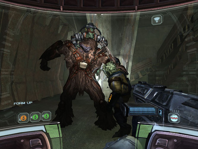 From here me and my team moved through the various meandering tunnels of the ship, blowing away battle droids and the like amidst the usual bouts of first person blasting action. The small little details are what stand-out most of all; the Metroid Prime-style HUD, the splashes of oil on your visor, the semi-interactive scenery, and best of all, your ever so helpful team mates. All these elements really help tie you in to the action and give you a proper front row seat.